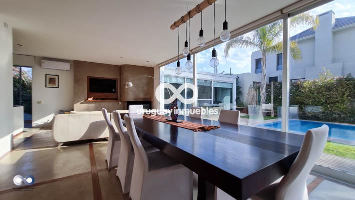Muy amplio living- comedor apaisado con vista a la piscina, estar con estufa a leña, amplia cocina y toilette.